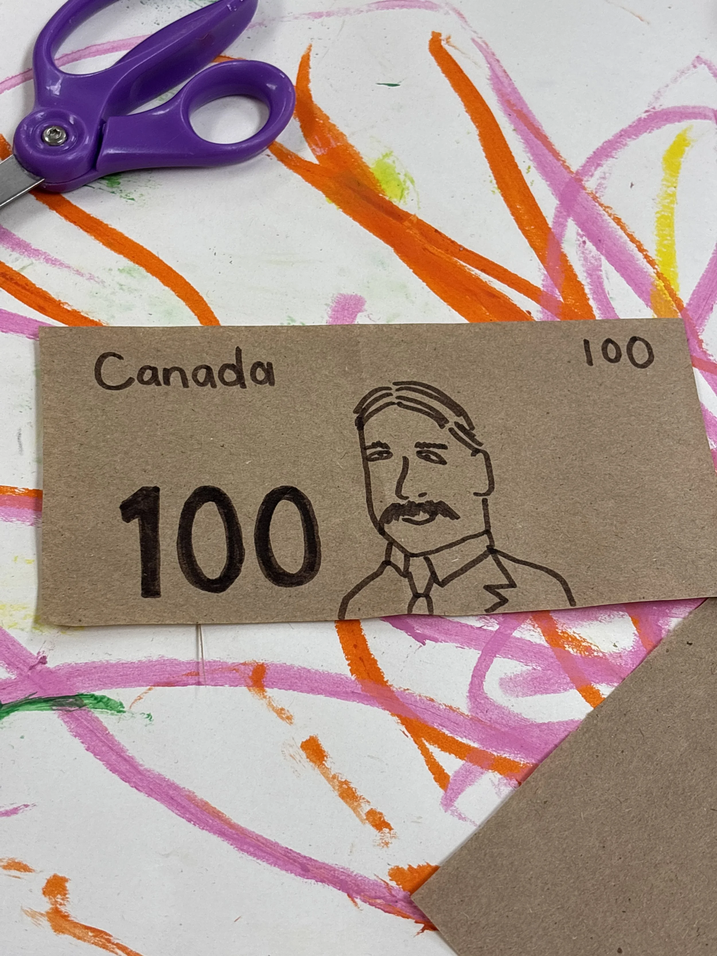 I Google search an image and show the kids a brown bill. I choose a piece of brown paper and cut out my bill. “Hhhhmm, I wonder who this guy is?” The kids come over to take a look at him. “Look it up!” they say. “Ahh, his name is Robert. Robert Borden. Do you know how we have a prime minister in Canada? Someone who helps take care of the country? Well Robert Borden wasn’t the first prime minister. He wasn’t the second. He was the 8th!” I begin drawing his face, talking aloud about my process as I go. “Hhhmmm, some of his hair goes this way, the rest goes like this. He has eyebrows above his eyes… a moustache under his nose…” Before I know I’m surrounded by little people with their own brown pieces of paper, drawing Robert Borden along with me.